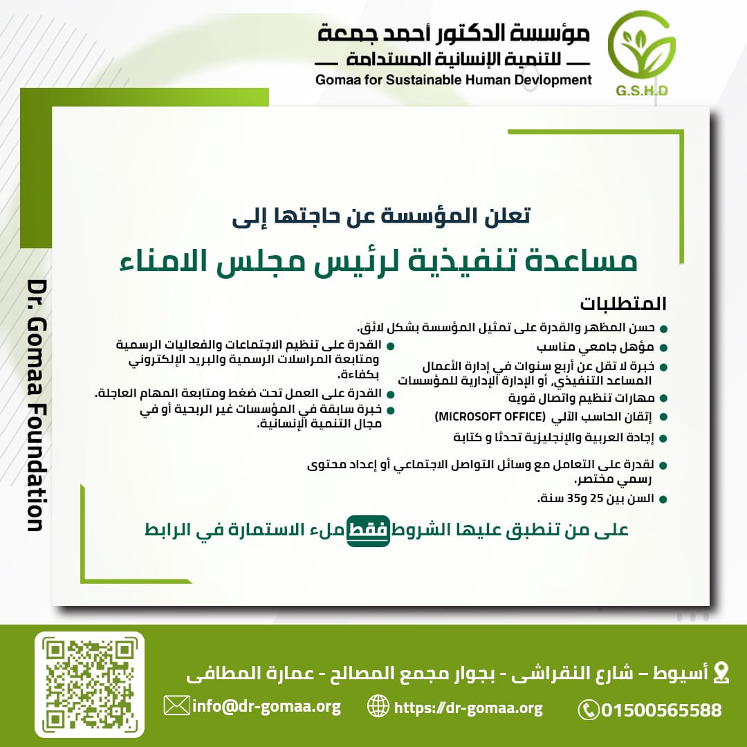 فرصة عملتعلن مؤسسة الدكتور أحمد جمعة للتنمية الإنسانية المستدامة عن حاجتها إلى مساعدة تنفيذية لرئيس مجلس الأمناء