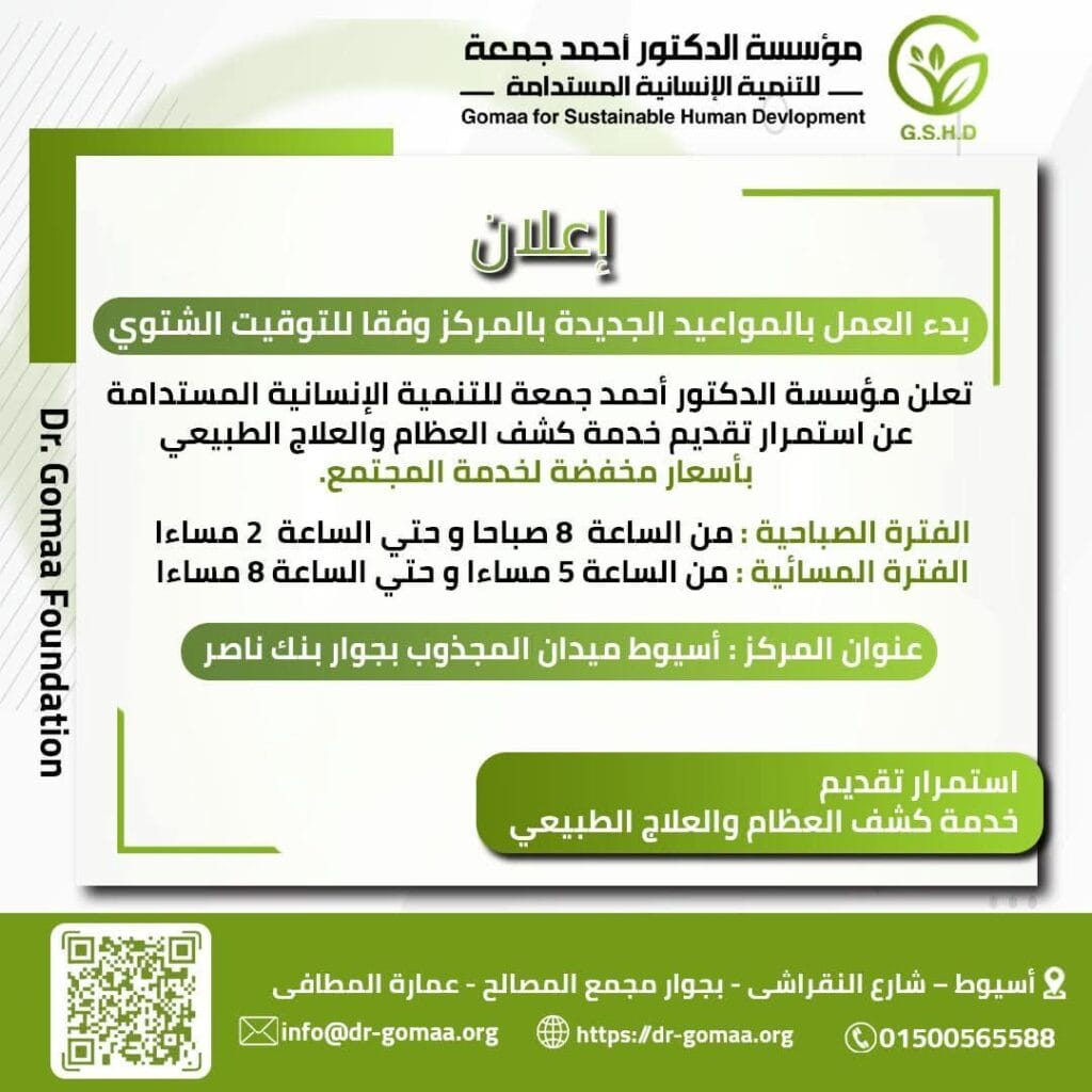 خدمة كشف العظام والعلاج الطبيعي بأسعار مخفضة لخدمة المجتمع، وذلك مع تطبيق مواعيد التوقيت الشتوي. بدءا من يوم الأحد 2 / 11 / 2025