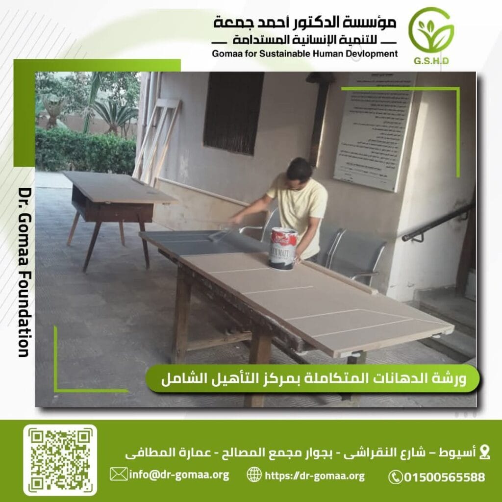 في إطار دعمها للتمكين المهني وتعزيز مهارات الشباب، تعلن مؤسسة الدكتور أحمد جمعة للتنمية الإنسانية المستدامة عن توفر خدمة الدهانات والتشطيب الفني للأثاث والخشب داخل ورشة الدهانات المتكاملة بمركز التأهيل الشامل (بنين) بمركز الفتح