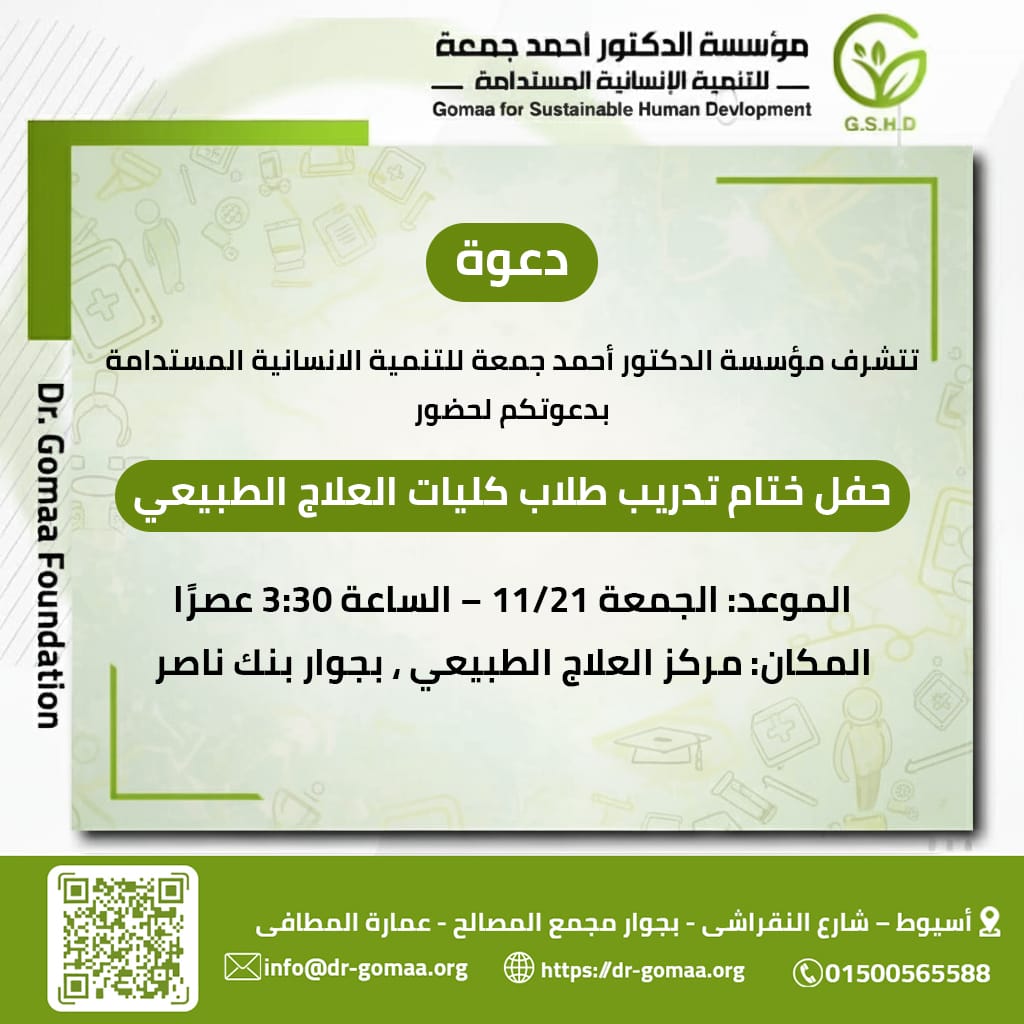 بكل الفخر والسرور، تتشرف مؤسسة الدكتور أحمد جمعة للتنمية الإنسانية المستدامة بدعوتكم لحضور حفل ختام البرنامج التدريبي لطلاب كليات العلاج الطبيعي الذين أنهوا فترة تدريبهم في مركز العلاج الطبيعي والتأهيل التابع للمؤسسة خلال الفترة من يوليو الي سبتمبر ٢٠٢٥.