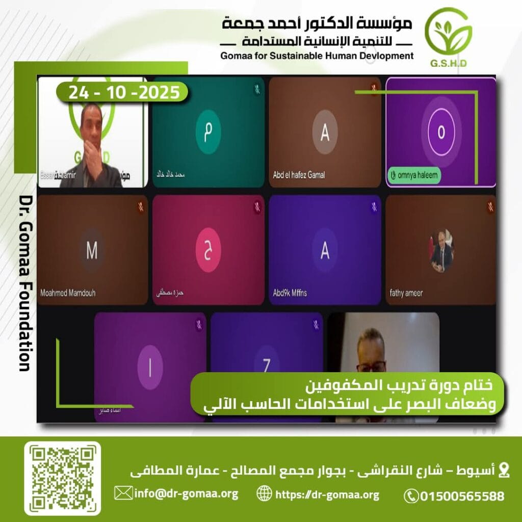 أسيوط-المركز الاعلامى للمؤسسة استكملت مؤسسة الدكتور أحمد جمعة للتنمية الانسانية المستدامة ، فعاليات الورشة الثالثة” أون لاين ” عن استخدامات