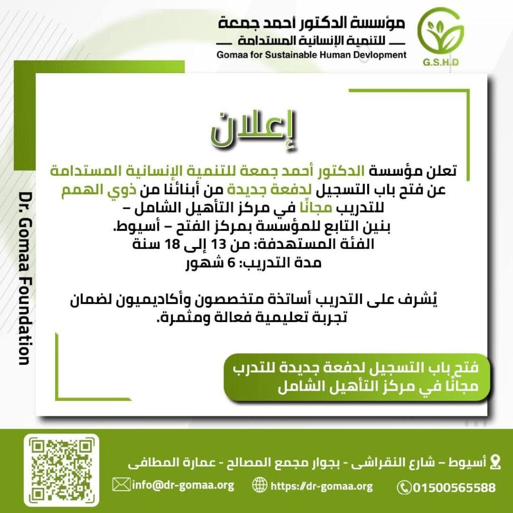 تعلن مؤسسة الدكتور أحمد جمعة للتنمية الإنسانية المستدامة عن فتح باب التسجيل لدفعة جديدة من أبنائنا من ذوي الهمم للتدريب مجانًا في مركز التأهيل الشامل – بنين التابع للمؤسسة بمركز الفتح – أسيوط.